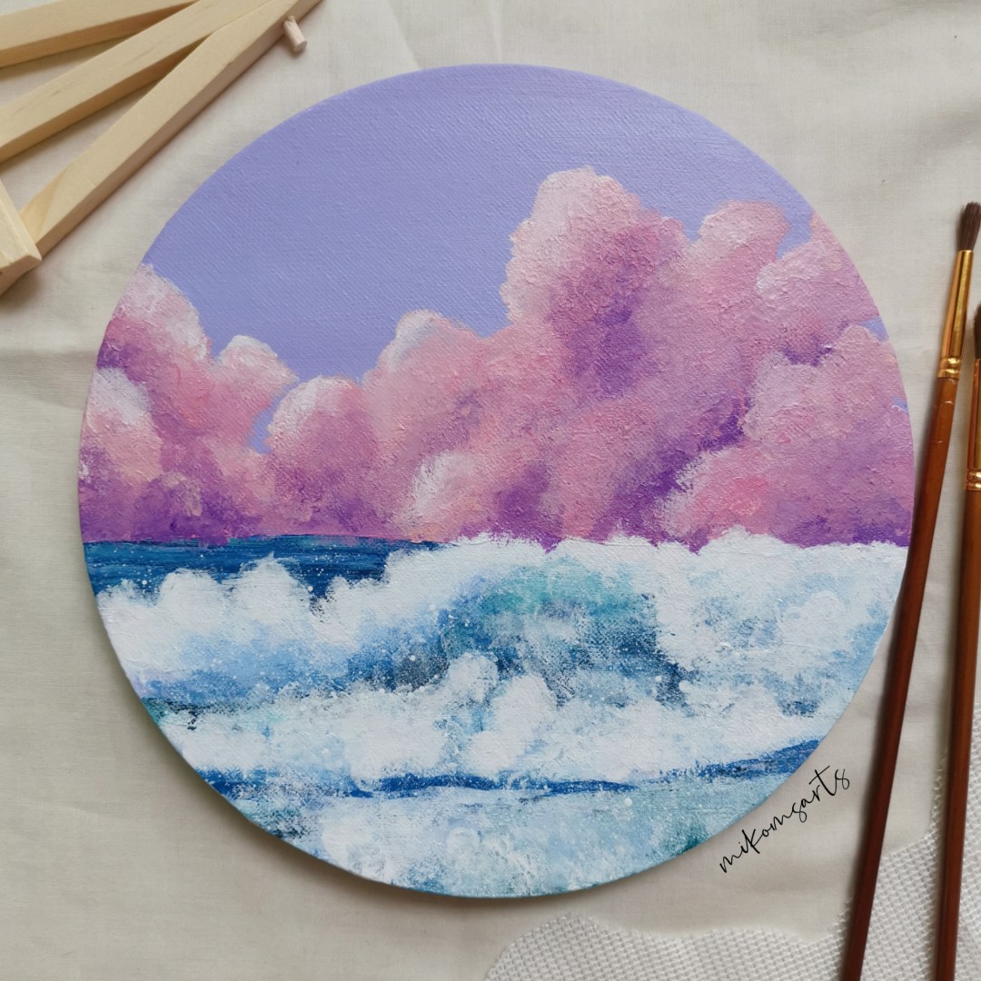Round Canvas Acrylic Painting Ocean Pink Cloud Hobbies Toys Stationery Craft Art Prints On Carousell